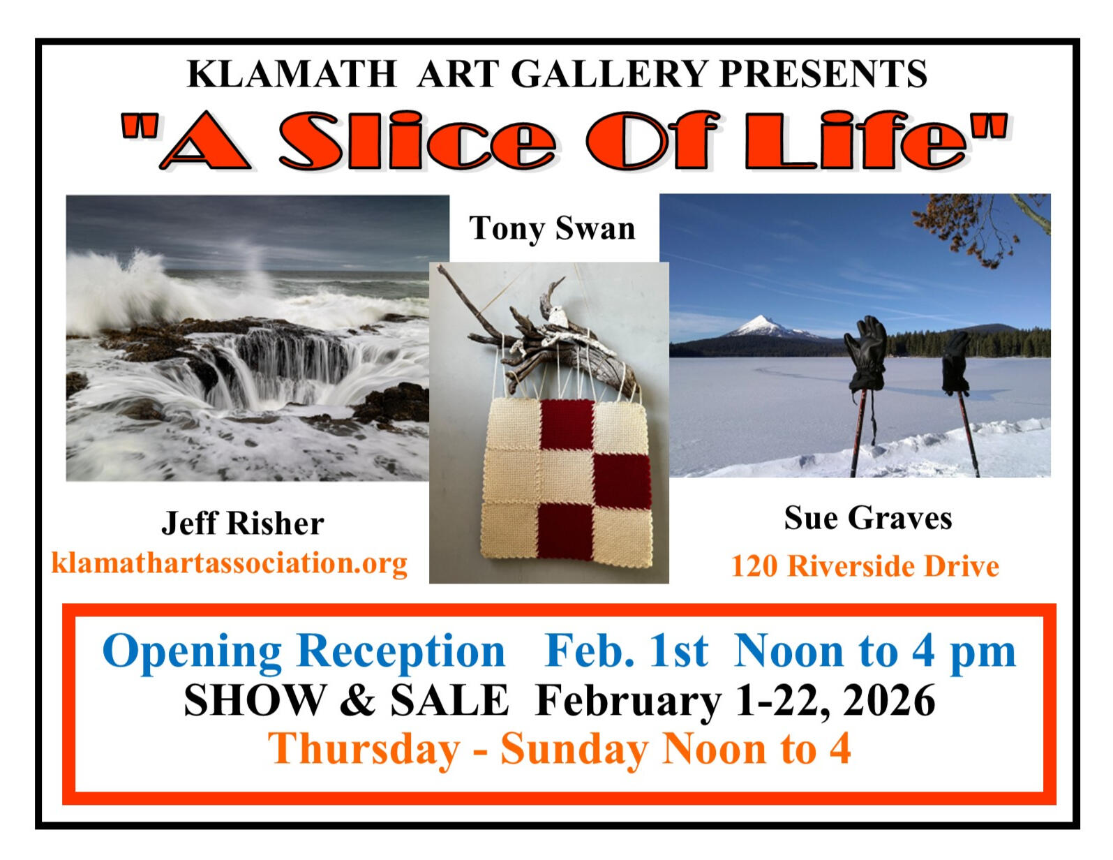 Click here for the most recent Klamath Art Association newsletter. Note that the exhibits for June and July of 2026 listed there have changed. Go to the Current and Upcoming Exhibits tab above to see the corrected exhibits calendar.